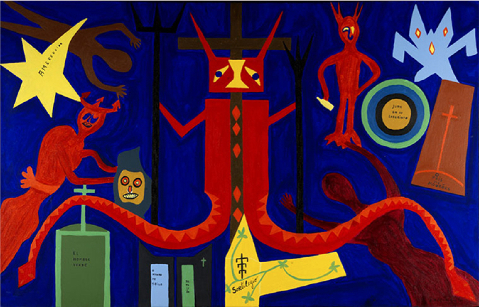 As pinturas aqui mostradas estão em um arco temporal que vai de 1968 – ano de sua primeira obra – a 1996. Por ter recebido uma bolsa da Fairfield Foundation nesse mesmo ano, o artista se muda para os Estados Unidos e estende sua residência no país até 1981. Sua produção pictórica, portanto, se confunde tanto com o estranhamento de uma cultura diferente da sua, quanto também com a instauração do governo militar no Brasil. Desse período de autoexílio surgem pinturas que se comunicam com sua vivência em um país estrangeiro e se relacionam com as causas do movimento negro e hippie nos Estados Unidos. O uso de bandeiras como ícones das nações, os três punhos cerrados característicos do movimento das panteras negras e o símbolo de paz e amor chamam a atenção e conferem outra camada interessante à sua produção.