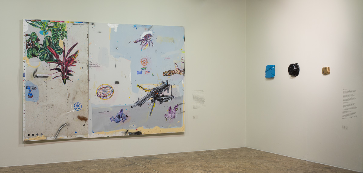 Por fim, ao seu lado, as imagens sampleadas por Pjota se espalham pelas superfícies de chapas metálicas. Enquanto o texto possui uma escala grande nas duas obras anteriormente exemplificadas, aqui a escrita chama a atenção devido ao seu tamanho diminuto. As palavras aqui não identificam as imagens como no exemplo anterior e vão de encontro à suspensão de um efeito imediato de dedução assim como proposto por Mignone. Representações pintadas de modo realista são distribuídas na superfície da imagem de modo a existirem individualmente, tal como ilhas do arquipélago que é o todo da pintura. Animais, armas, cristais, logomarcas e até mesmo bandeiras estão presentes e intrigam o olhar do espectador.