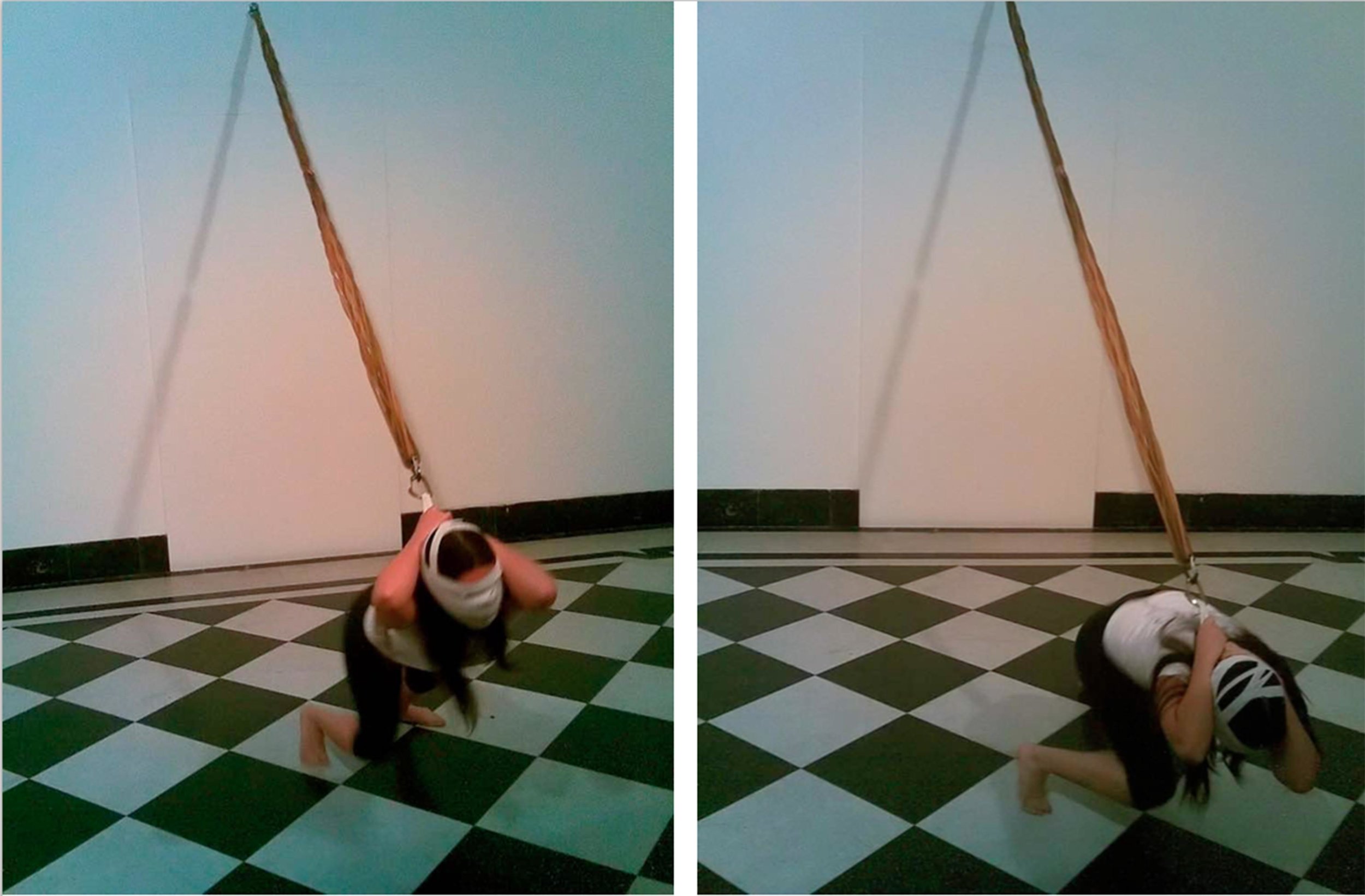 GM: It was a course where we’d turn up and show each other what we were doing at the time and discuss it. It was an important moment for me, because I met a lot of people my age who were starting to do something in art. We had an exhibition that would close the semester, and that was when I did that performance. At that time, I had no experience, especially with showing my work in public. It was actually the first time I did it, so it was a radical experience for me. The action was a bit dangerous—I had my head attached to rubber ropes hanging from the ceiling. There was no structure for what I was doing. I invented the whole apparatus, so I wasn’t sure what was going to happen, if it was going to sustain my weight. But the experience of putting my body in that situation was very important in my formation as an artist. After grad school I did a Masters and now I’m finishing my doctorate. I’m also a professor now at the visual arts course at Federal University of Rio de Janeiro.
