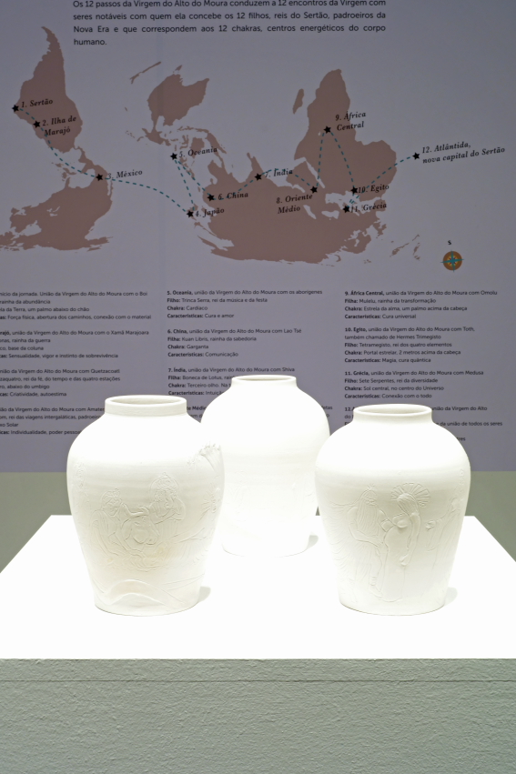 A semente dessa proposição é uma provocação: e se, em vez de olhar para a produção de escultura em barro e buscar ali as “raízes do Brasil”, o público fosse convidado a uma odisseia multicultural com elementos de diferentes partes do mundo? Eis que nasce a Virgem do Alto do Moura. Baseada em uma escultura de Vitalino em que se vê uma noiva sendo carregada em um boi com seu marido à frente, esta mulher é alavancada à protagonista da narrativa, sem a necessidade dessa figura patriarcal, mas mantendo seu animal como meio de transporte. Chamada por Virgem, em sincretismo com o cristianismo, ela viaja diversas regiões do mundo que possuem tradições milenares no campo da cerâmica – Caruaru se torna um cometa que atravessa do México a Oceania, sem nos esquecermos da África, da Ásia e das tradições greco-romanas, rumo à Atlântida. A Virgem do Alto do Moura se desdobra entre imagem e texto. Há aqui a vontade de refletir sobre a relação entre documento e ficção, como feito por Nadam em relação ao Grupo Um e seus artistas fictícios com biografias e pesquisas destoantes. O artista convida o público a adentrar essa história que se baseia tanto na fonte textual, composta pelo próprio, quanto nas esculturas relativas às viagens da Virgem, às suas experiências sexuais com diferentes entidades espirituais e, claro, aos seus filhos.