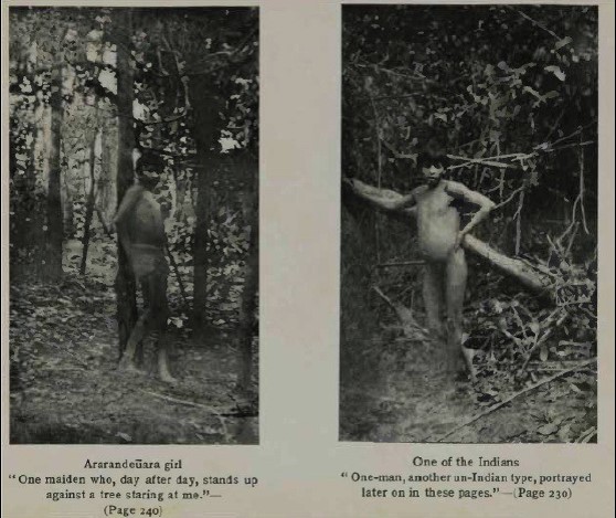 Em outros dois pares de imagem, a mesma sensação de coação pode ser percebida. Na ausência de certeza sobre uma visão dirigida da pose feita por Lange, esses índios mais parecem se apoiar nesses pedaços de árvores a fim de escorar seus corpos ou tentar se esconder da violência da caixa preta à sua frente. As legendas aqui, novamente, são pensadas de modo malicioso. A “garota Ararandeuara”, como o próprio Lange descreve, é “uma serviçal que, dia após dia, fica de pé contra uma árvore me olhando”. Já seu par, chamado “um dos índios”, é “um homem, outro tipo não-indígena”.[viii] A relação imagem e texto, portanto, sempre se subjuga à narrativa da publicação e, no caso da primeira imagem, tenta condicionar a imagem a uma suposta ideia de verdade histórica, ou seja, a fotografia é a prova de que essa garota efetivamente estava a fitar o explorador encostada em uma árvore – mas quem pode garanti-lo? Na ausência de outros meios de documentação e na certeza da dimensão de realidade que essas imagens proporcionavam no começo do século XX, talvez seja melhor encarar Lange como um grande contador de histórias e também produtor das imagens que as embasam, do que propriamente um dono da verdade.